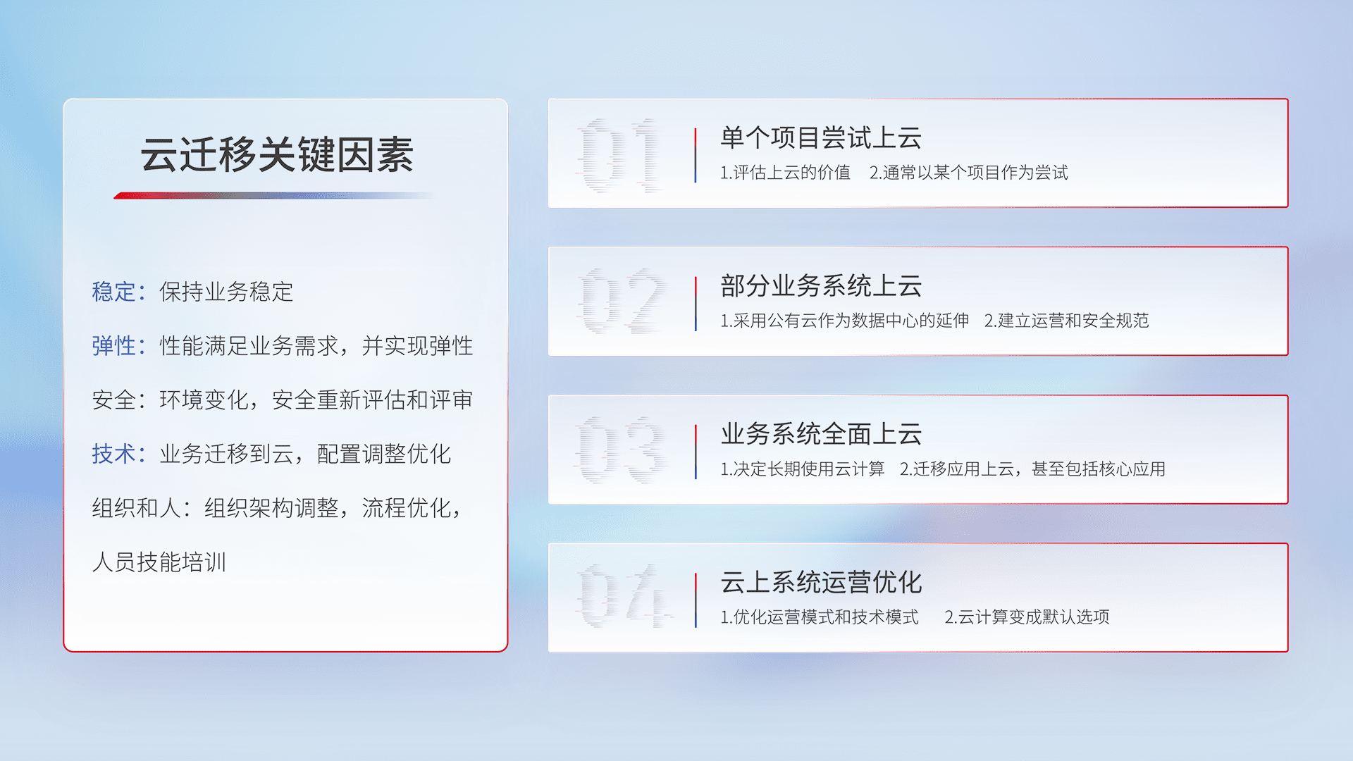 结合实际业务,,,,从规划设计、、、、云平台选型、、云原生改造、、数据迁移、、、、集成交付,,,,迁移全过程为客户识别最佳上云路径,,,做好风险识别管理,,设计网络架构、、、、身份权限、、安全审计合规、、、操作审计、、、、日志审计、、监控告警策略、、、、多站点容灾设计等,,,,对云上基础设施进行整体规划,,,提升IT治理水平,,,,以满足弹性、、高可用、、、、高性能的需求。。。。